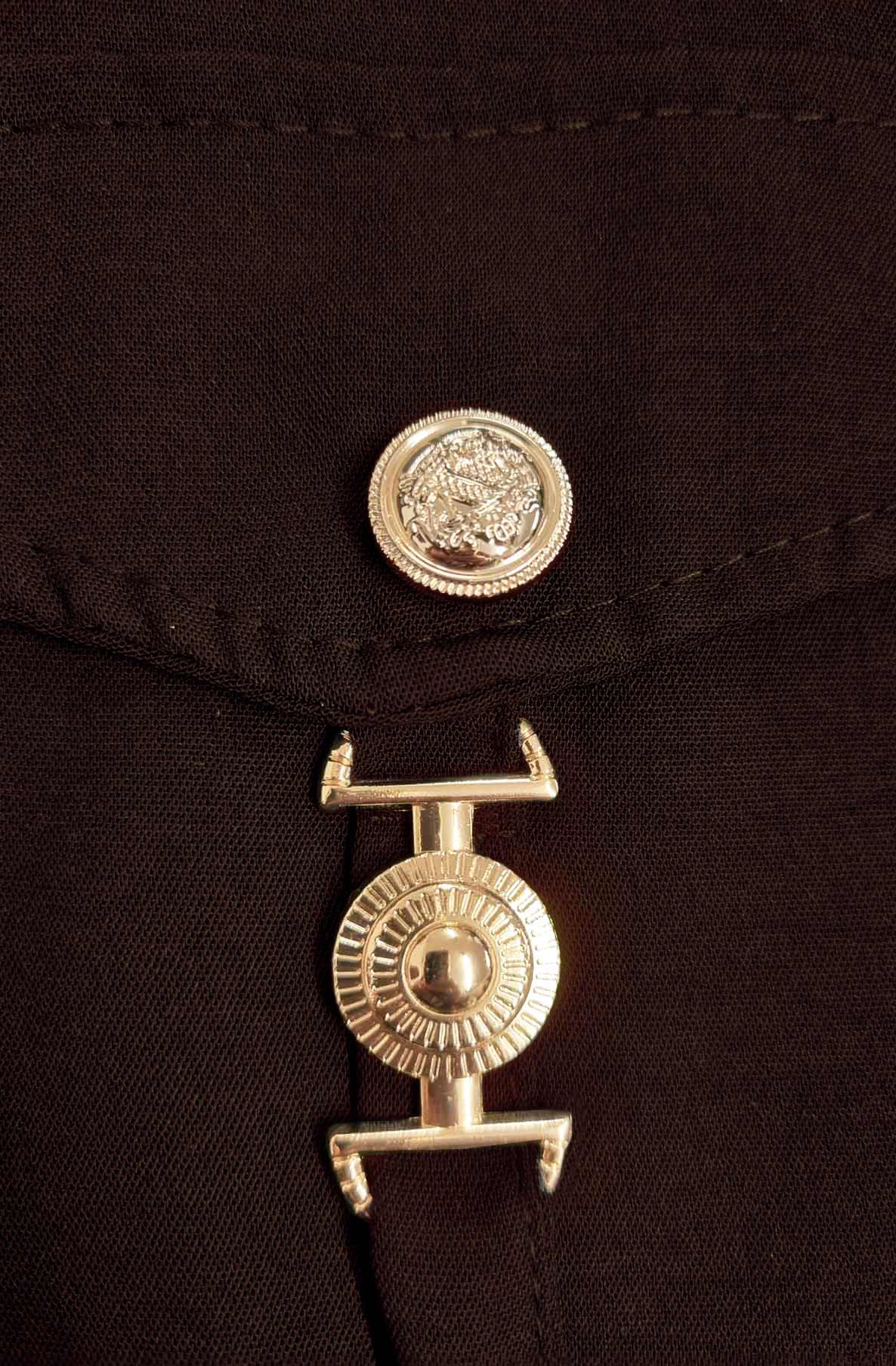 Crafted from smooth, soft-touch fabric, it features a classic collar, a glossy button-through front, and elegant gold-tone buttons on the placket and cuffs. The standout detail? Gold embellished appliqué accents on both pockets, giving the blouse a luxurious boutique finish 💎.