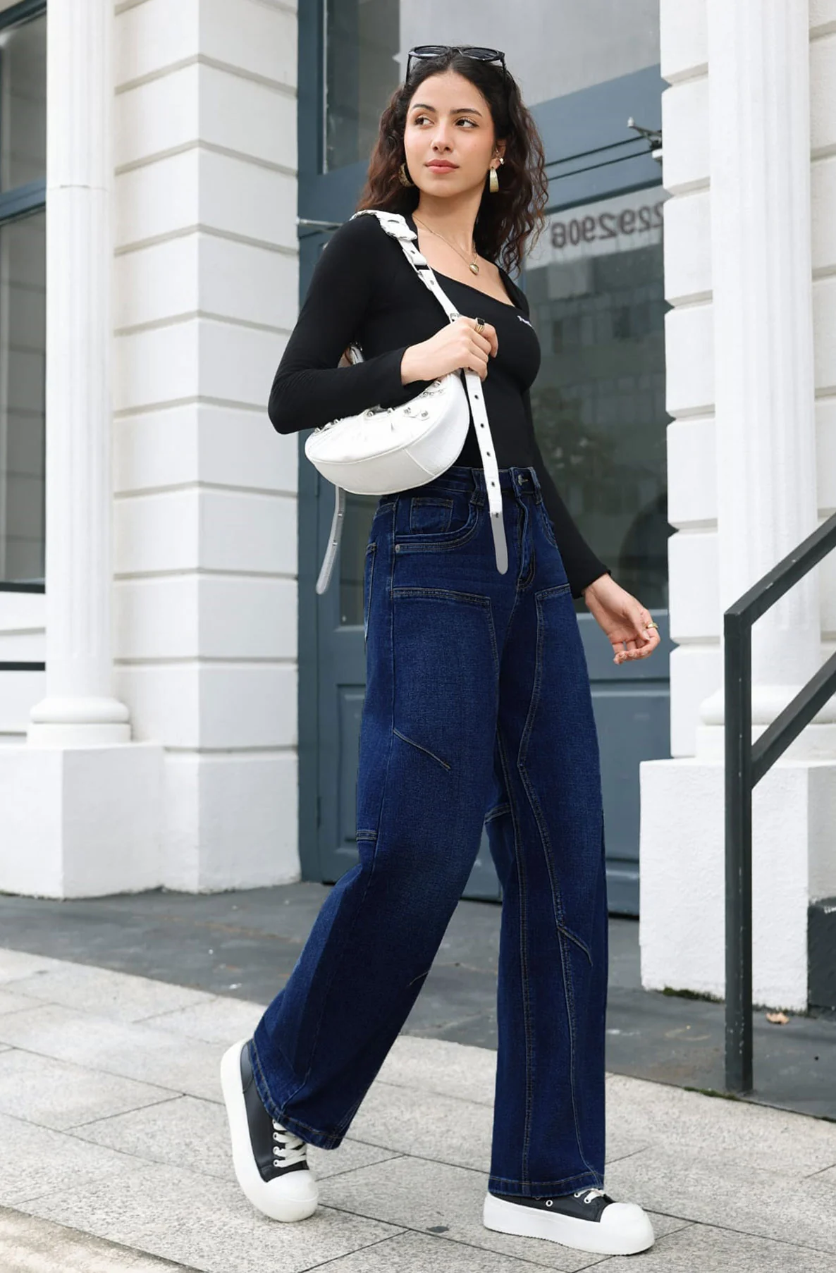 Reyka High Waist Panel Seam Balloon Denim Jeans-Dark Blue
